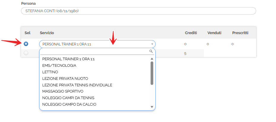 - se il cliente non dispone di un multipack per la prenotazione del servizio oppure non desidera sfruttare il proprio multipack per la prenotazione, basterà selezionare il servizio dal menù a tendina (primo campo) per poi procedere alla vendita del servizio;