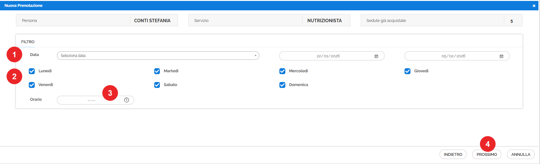 N.B. in caso i giorni della settimana e/o gli orari destinati alla prenotazione siano diversi tra loro, si consiglia di selezionare un giorno e un orario casuale e poi cambiarli a seconda della necessità nella maschera successiva. Esempio: lunedì alle 11:00 e mercoledì alle 10:30. |