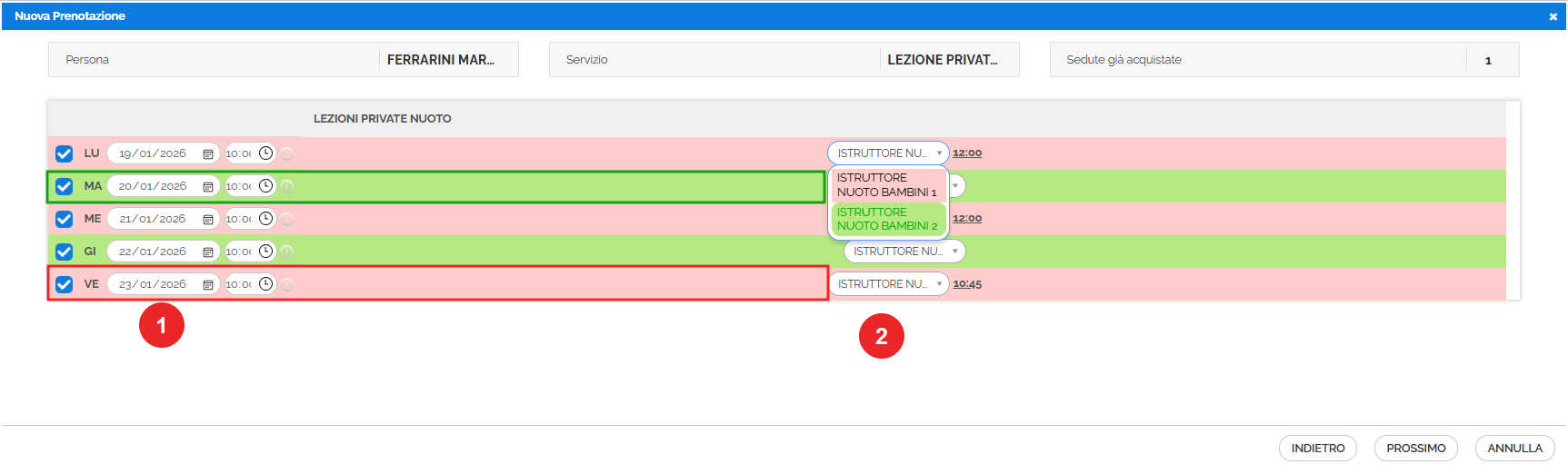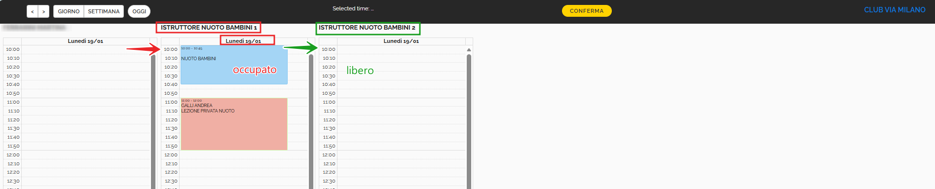 - il colore rosso indica che le risorse nell'orario prescelto sono occupate, ma è comunque possibile forzare la prenotazione. Accanto al nome della risorsa non disponibile viene indicato il primo giorno e orario in cui la risorsa è eventualmente disponibile per la prenotazione (nell'immagine di esempio si nota come l'istruttore di nuoto bambini 1 non sia disponibile alle 10:00 di lunedì 19 gennaio, ma sono disponibili come orari le 12:00 . E inoltre possibile selezionare l'istruttore di nuoto bambini 2 che è invece disponibile alle 10.00). ù