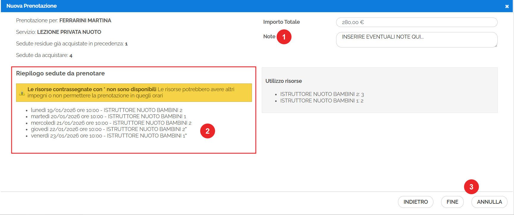- Riepilogo delle sedute da prenotare. Nel caso in cui si proceda con la prenotazione di un orario/giorno in cui una o più risorse non siano disponibili, in fase di conferma vendita il programma segnalerà con asterisco le risorse non disponibili.