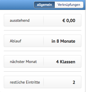 - Klassen: in der ersten Reihe ist die Klasse gebucht, in der zweiten hat der Benutzer an der Klasse schon teilgenommen und in der dritten Reihe hat der Benutzer an der Klasse nicht teilgenommen. Man kann Zugänge hinzufügen (Anwesenheiten) und Klasse löschen (und eventuell das Guthaben für die Klasse erstatten).
