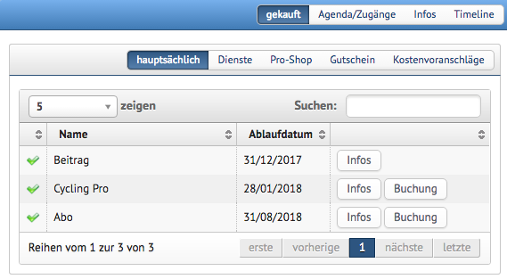 hauptsächlich: Abos des Benutzers. Es ist möglich, Klassen durch dem "Buchung"-Button zu buchen.