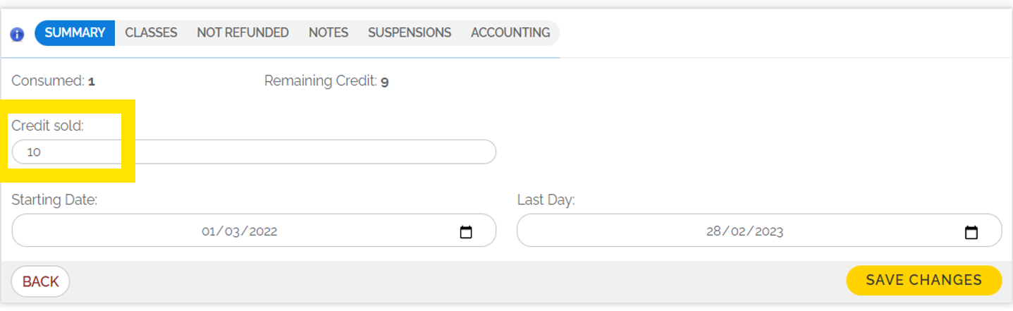 - add the credit to be refunded in the field highlitghted in the picture below. Example: if the customer used 1 credit and therefore can still use 9 credits, it won't be possible to modify these two fields, the only editable field corresponds to the credit sold. So the total of 10 credits will have to be changed into 11 credits, to allow the customer an extra credit.