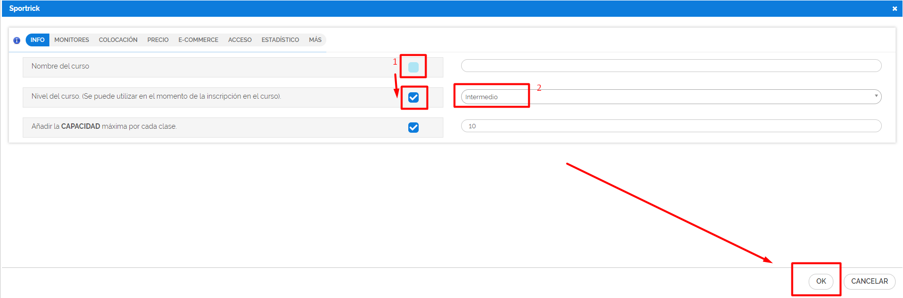| INFO | Nombre del curso: por defecto, el nombre corresponde a la actividad, día y hora elegidos en la planificación del curso | Sí |