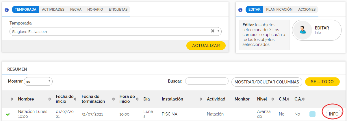 Si los datos editados tienen que ver con la planificación de los cursos (zonas, horarios, aforo, fechas, días de la semana, monitores etc..), para actualizar los cambios aportados es necesario utilizar el botón "Reprogamar los Cursos Seleccionados" en la sección PLANIFICACIÓN.