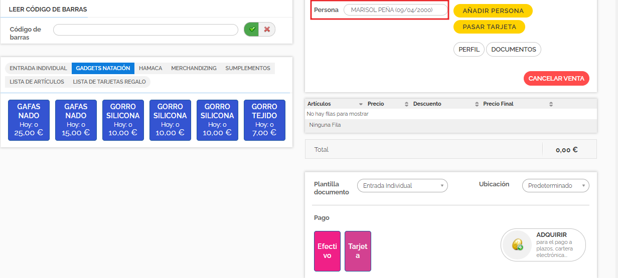 | venta a un cliente registrado | para efectuar una venta a un cliente registrado en SPORTRICK, es necesario especificar el nombre en el campo Persona antes de seleccionar el artículo para la venta.