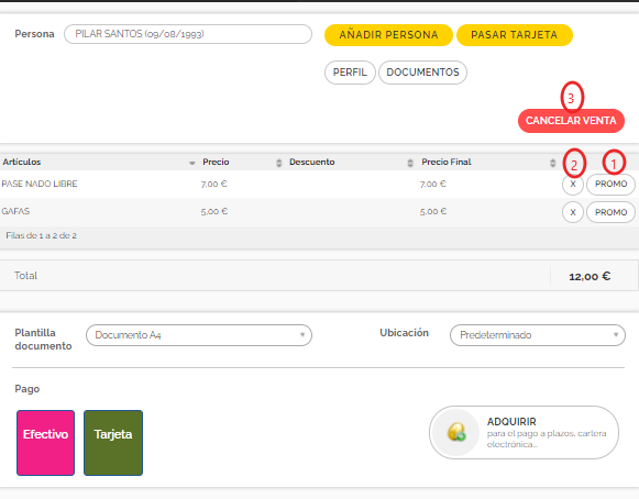- vaciar el carrito de compras a través del botón rojo "Cancelar Venta".