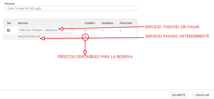 - seleccionar el servicio de la lista despegable. Si el cliente ha pagado el servicio antes de reservarlo o dispone de un multipack que permite la reserva (aparecerán los créditos disponibles) será posible seleccionarlo para non incurrir en costes adicionales. De otra forma, habrá que seleccionar el servicio de la lista despegable.