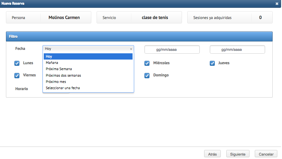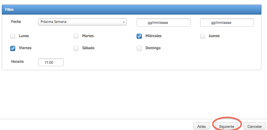 - seleccionar el intervalo de fechas entre las opciones disponibles (hoy, mañana, próxima semana, próximas dos semanas, próximo mes o seleccionar el intervalo de fechas específicas). Luego seleccionar la combinación de días de la semana y la hora que el cliente desea reservar. Si la hora/días de la semana son diferentes, seleccionar un horario/díás al azar ya que se pueden cambiar en la fase sucesiva (después de hacer clic en SIGUIENTE)