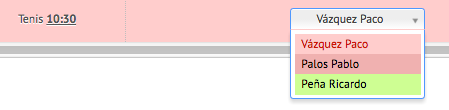 - el resumen ofrece la posibilidad de cambiar la hora, el día o el recurso que no esté disponible. El horario al lado del recurso corresponde a la primera reserva disponible. Es además posible forzar la reserva aunque un recurso esté marcado en rojo (rojo = no disponible). En la imagen del ejemplo, la pista de tenis abre a las 10:30 y Paco no está disponible para dar clases antes de las 13:00, mientras que el sábado no trabaja. Para averiguar la disponibilidad de los recursos, es suficiente hacer clic en el icono con el reloj.
