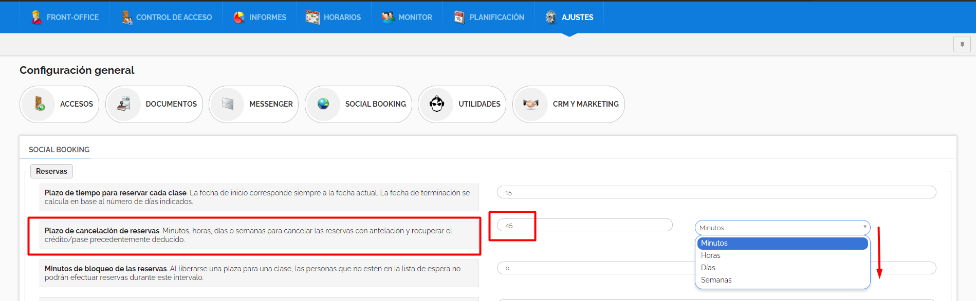 - minutos: las clases de hoy se pueden reservar a partir de x minutos antes de que empiecen. Ejemplo: la clase empieza a las 11:00, minutos configurados = 50 -> la clase se puede reservar a partir de las 10:10;