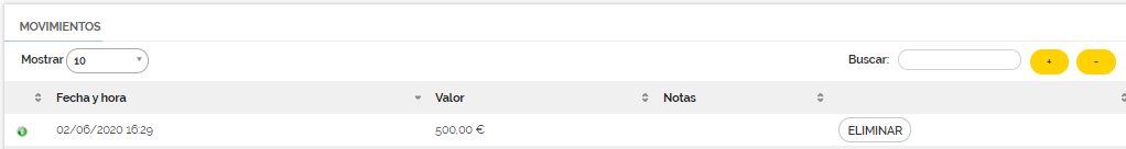 El sistema registra cada operación con la fecha y la hora. Es posible cancelar los cambios a través del botón Eliminar.