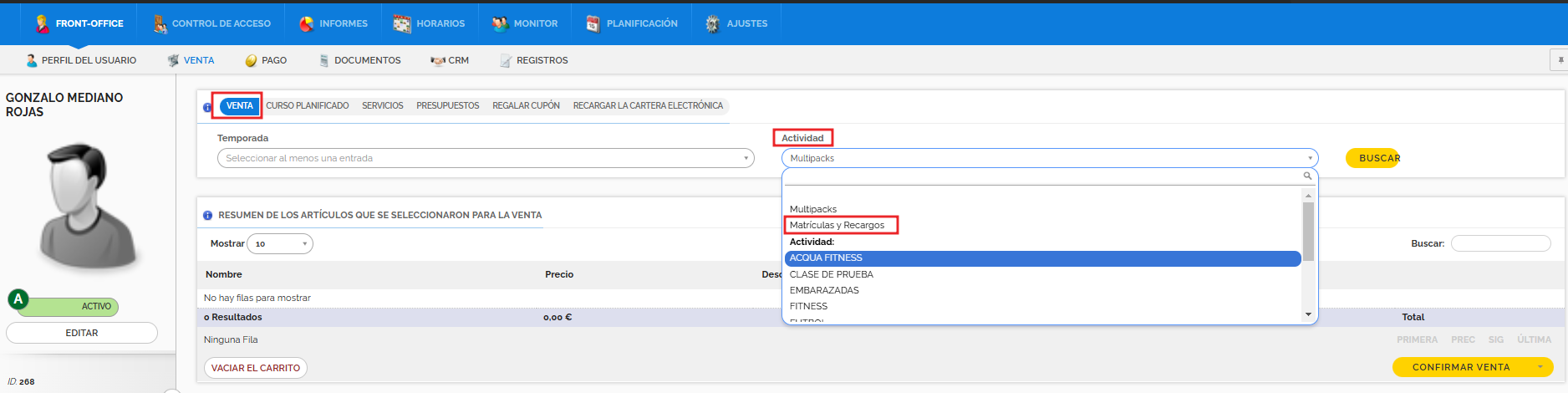 Para vender la cuota anual/matrícula o carnet de socio, es necesario entrar en el perfil de usuario y hacer clic en Venta.