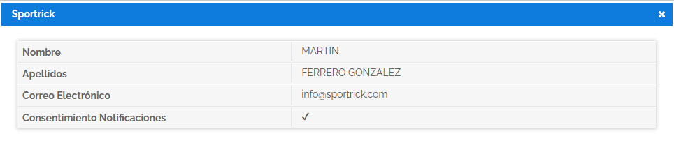 MarketingAgreement (posibilidad de recibir o menos notificaciones por correo/SMS desde la sección Report > Marketing de Sportrick)
