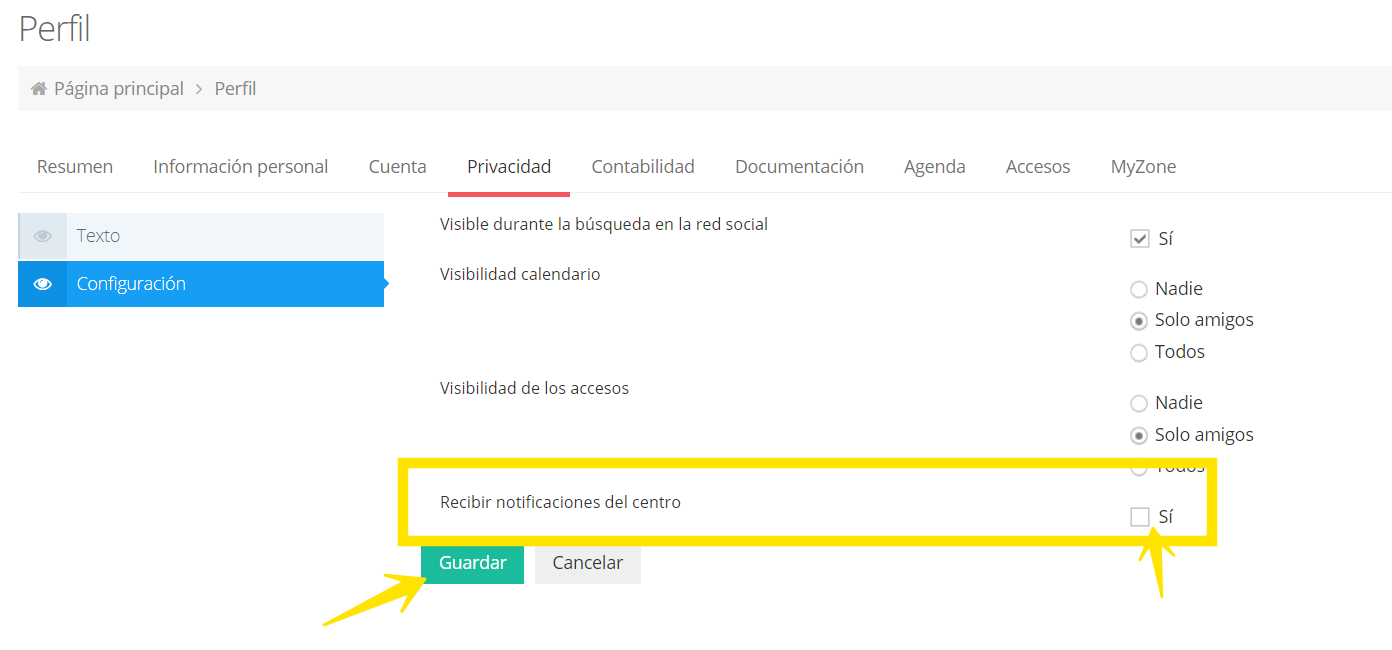 Desde el perfil E-Commerce, en la sección Privacidad, es posible desactivar la opción (la casilla tiene que quedar blanca) para no recibir las comunicaciones enviadas por el centro.