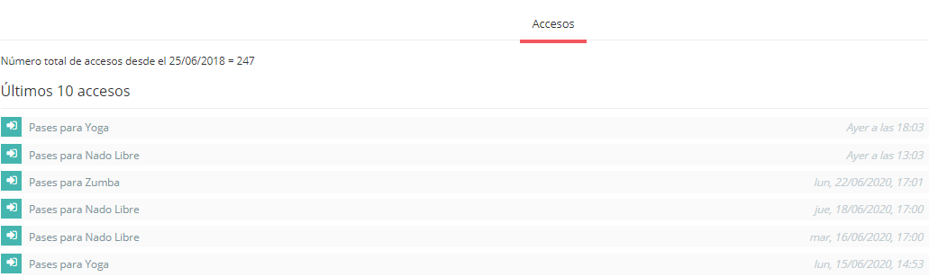 El sistema proporciona un listado de los últimos 10 accesos y la cuenta de todos los accesos desde el primero.