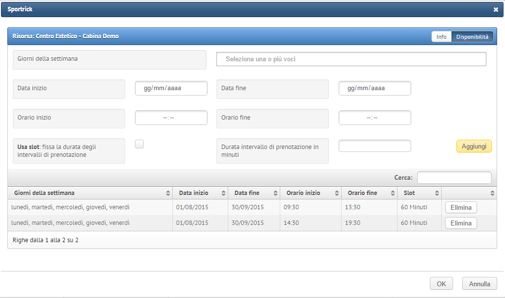 Una volta premuto il tasto Aggiungi e creata la disponibilità di prenotazione per una risorsa, non è possibile modificarla, sarà necessario premere Elimina e ripianificare la disponibilità per poi riaggiungerla.