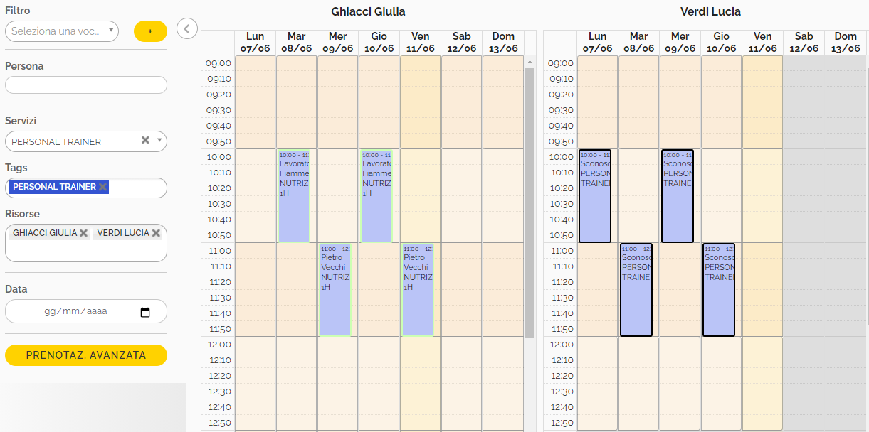 Esempio di visualizzazione nella maschera di prenotazione servizi del Front-Office: selezionando il tag, in automatico apparirà l'agenda di tutte le risorse alle quali è stato assegnato quel tag in pianificazione. Questo trucco permette di evitare di selezionare manualmente le risorse una ad una per visualizzarne la disponibilità di prenotazione. Sarà poi possibile scegliere tra le risorse disponibili quella preferita dal cliente