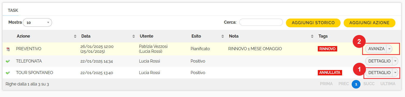 - L'operatore tra parentesi è l'operatore che ha censito lo storico/l'azione CRM