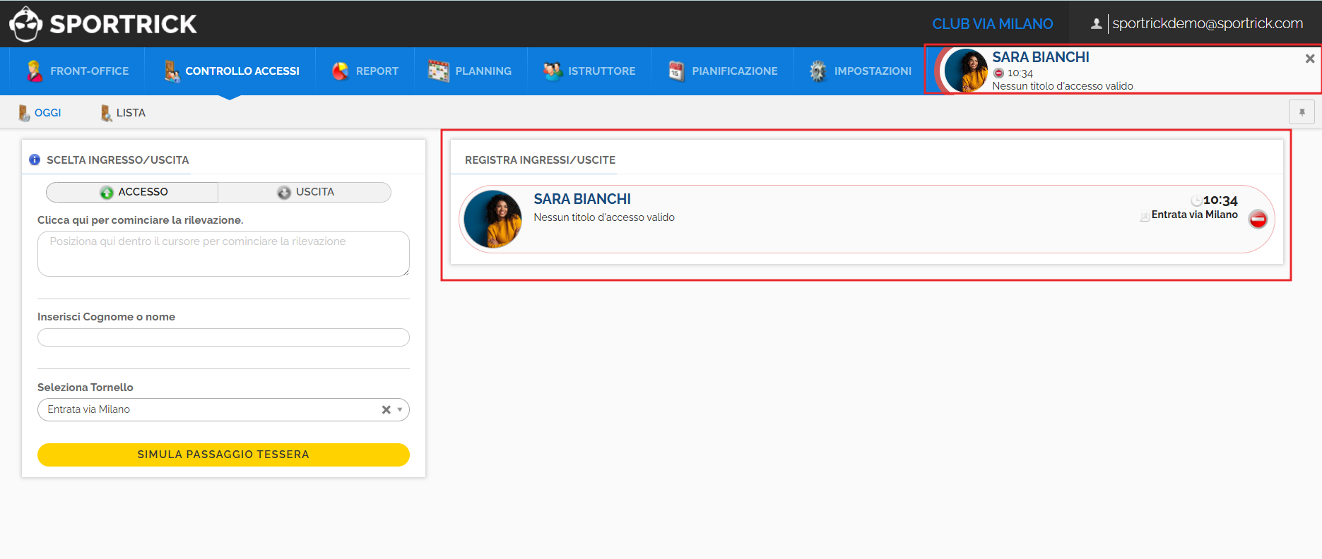 Quando il cliente dimentica la sua tessera, è possibile censire il suo accesso e aprire il tornello direttamente dalla maschera di Controllo Accessi.