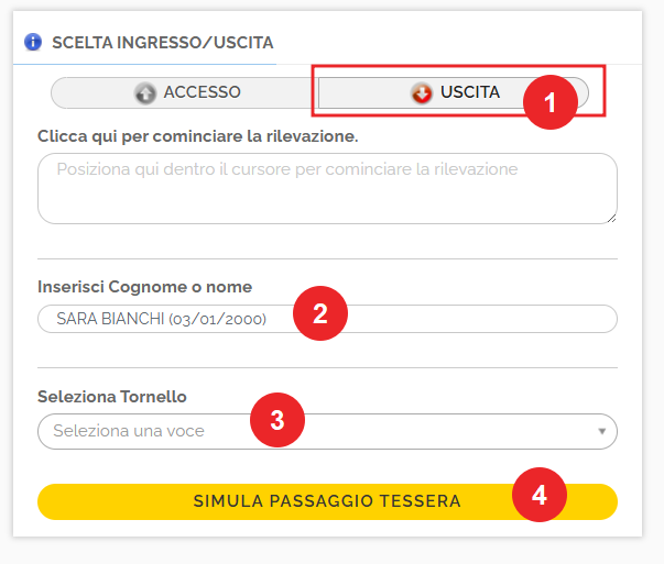 Lo stesso procedimento vale in caso di censimento dell'uscita del cliente, basterà selezionare "Uscita" prima di procedere con la simulazione. Per l'uscita è necessario disporre di un terminale per il controllo accessi dedicato all'uscita.