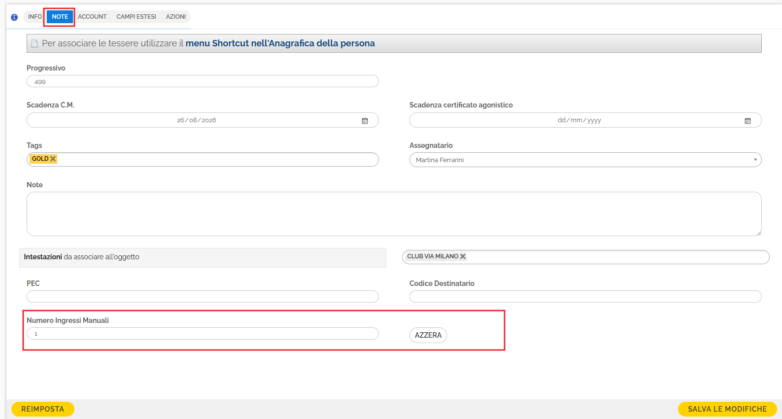 Nell'anagrafica di ogni cliente si trova il conteggio degli accessi manuali effettuati (cliccare su Modifica sotto l'immagine del profilo, poi su Note).