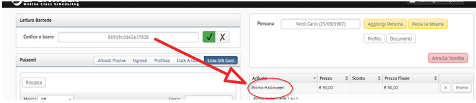 A seguito della scansione del codice, il sistema aggiungerà la gift card corrispondente a quel codice al carrello acquisti.