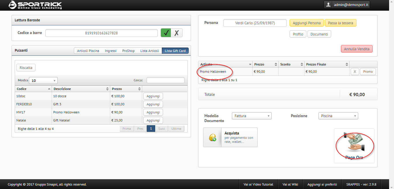 Una volta venduta, la gift card deve essere riscattata (verifica codice) per poter essere utilizzata. A questo proposito, si veda il manuale: Riscatto GiftCard