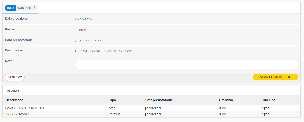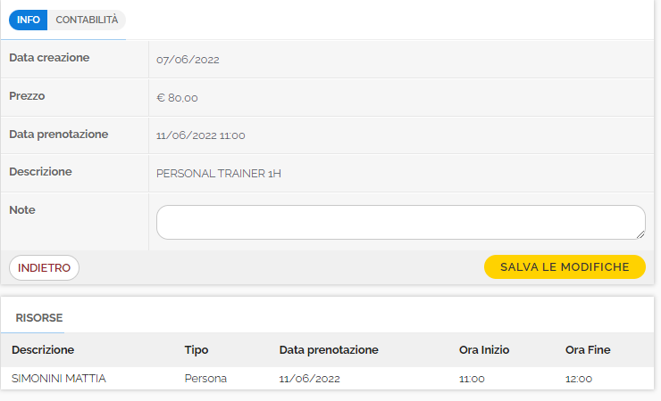 - visualizzare informazioni sul servizio prenotato, come data di prenotazione, prezzo, descrizione del servizio, risorse coinvolte nel servizio e possibilità di aggiungere note;