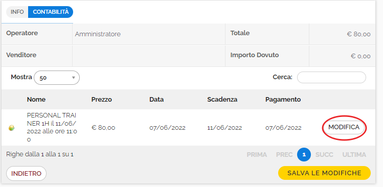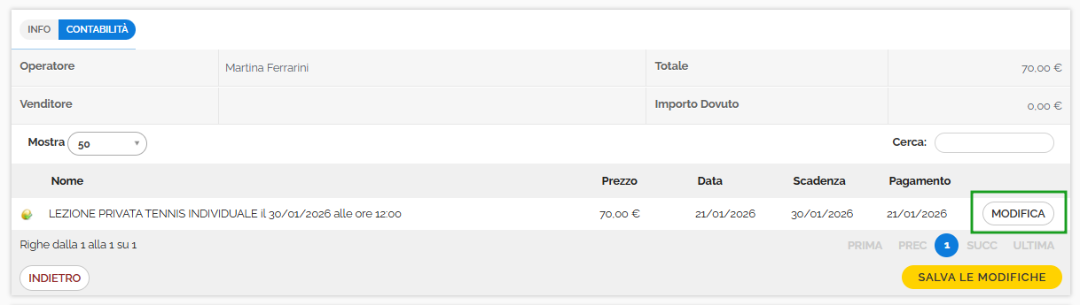 - consultare/modificare i dati relativi alla vendita cliccando sul tasto Contabilità e successivamente su Modifica.