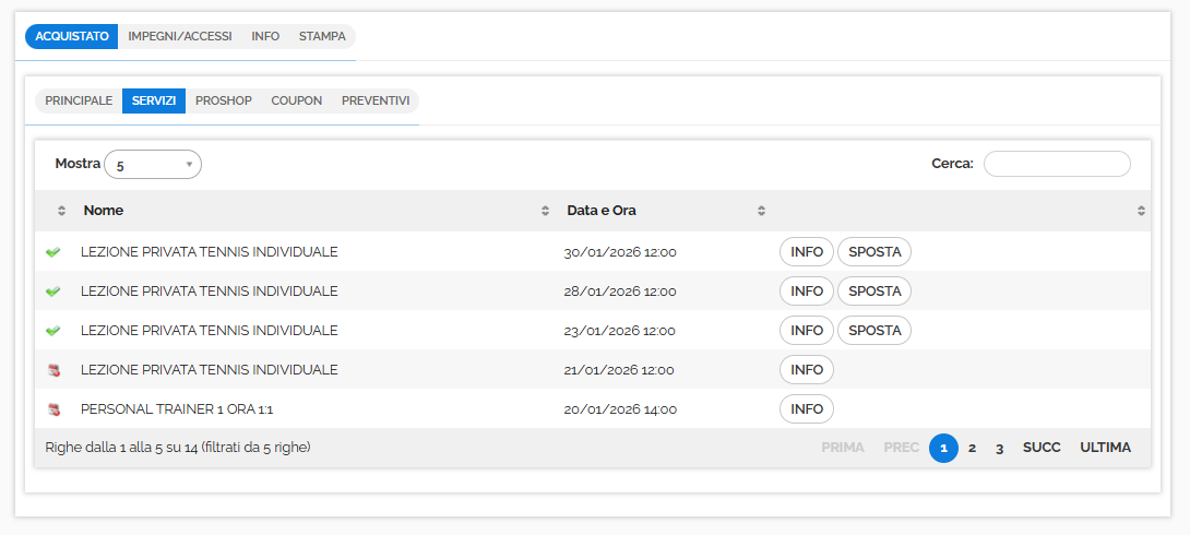 Nella parte centrale dell'anagrafica cliente alla voce Acquistato > Servizi si trova un riepilogo dei servizi acquistati/prenotati dal cliente.