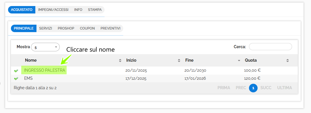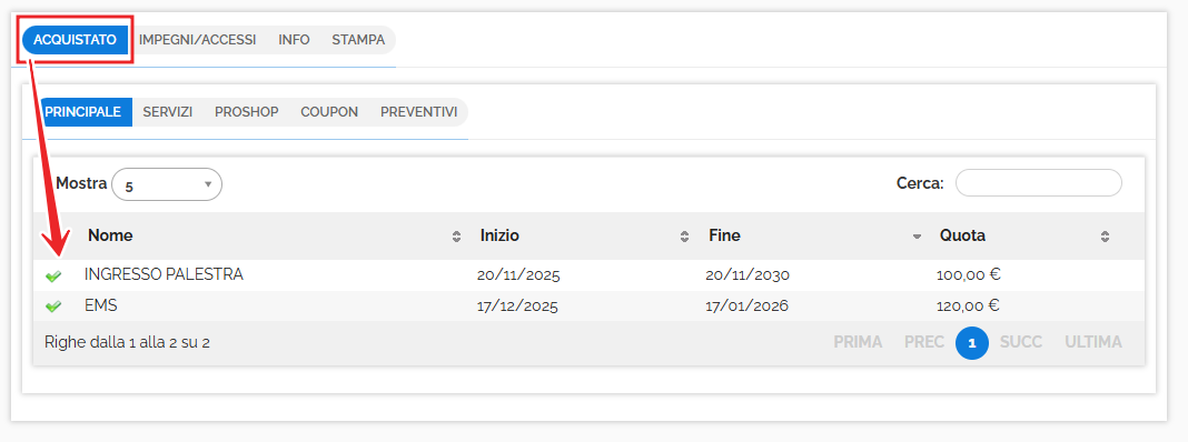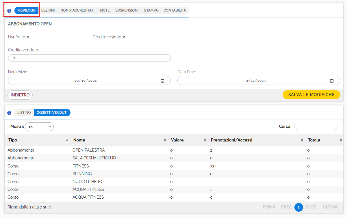 Nella tabella degli Oggetti Venduti si trova un riepilogo di cosa comprende il multipack (modello accesso, corsi, servizi...). In caso il multipack sia collegato a un listino prezzi, anche quest'ultimo verrà indicato. Al lato di ogni modello accesso, servizio o corso, vengono indicati gli eventuali crediti a scalare e quante prenotazioni o accessi sono stati effettuati per quel modello accesso/corso/servizio. ![]() |