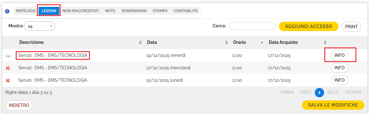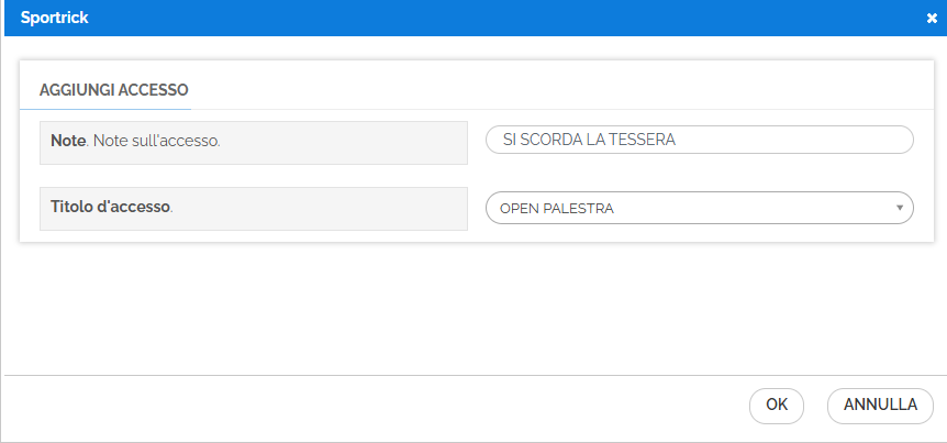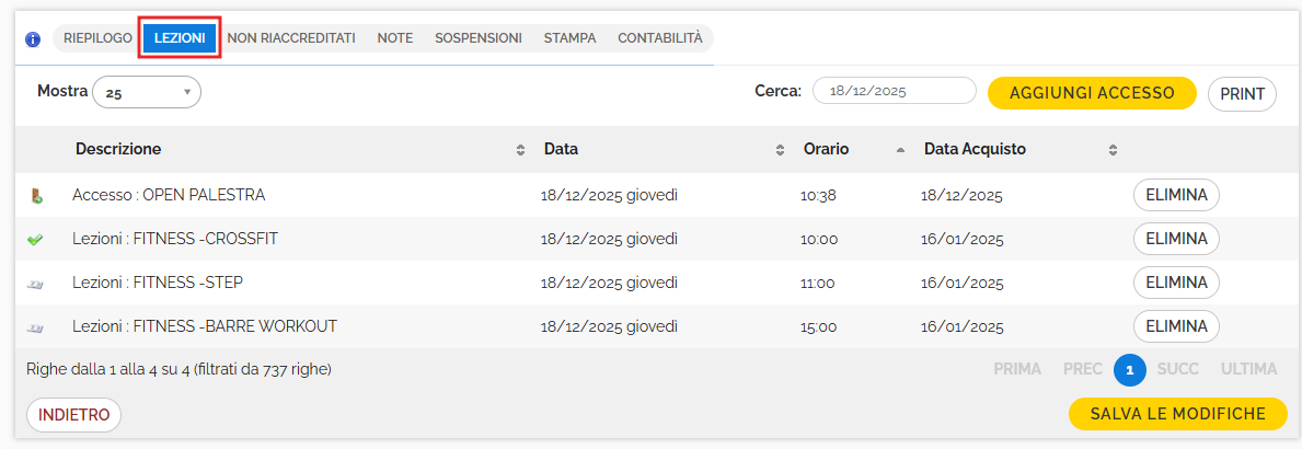 Per eliminare un accesso cliccare sul tasto Elimina a fianco dell'accesso da cancellare. Il tasto Print permette la stampa dell'elenco delle lezioni/servizi/accessi. Per aggiungere un accesso cliccare sul tasto giallo, con la possibilità di aggiungere eventuali note sull'accesso, che saranno poi visualizzate nella maschera di controllo accessi, dato che l'accesso verrà registrato in tempo reale. Non si possono aggiungere accessi retrodatati.