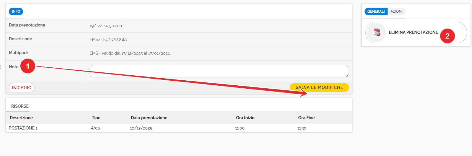 Per i servizi, tramite il tasto Info a fianco della prenotazione del servizio si potranno inserire delle note (ricordandosi di salvare le modifiche) oppure eliminare la prenotazione cliccando sul tasto apposito.