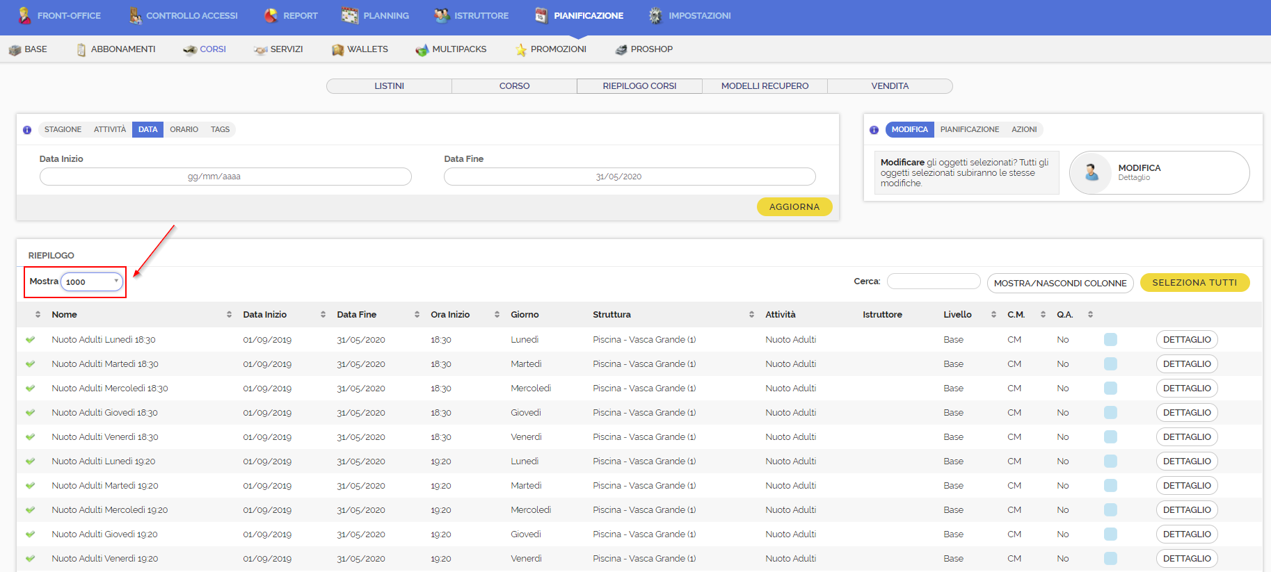 - Utilizzare il Menu a tendina di fianco a Mostra per visualizzare tutti i corsi a disposizione (nel caso fossero più di 1.000, occorrerà ripetere l'operazione sui corsi rimanenti);