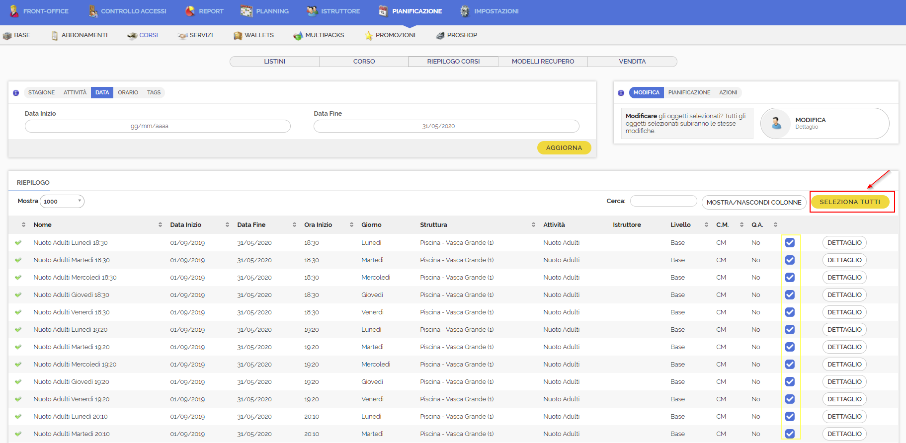 - Apporre il flag sui corsi da modificare sfruttando i singoli quadratini, oppure utilizzare il pulsante Seleziona tutti per selezionare automaticamente tutti i corsi presenti all'interno della schermata: