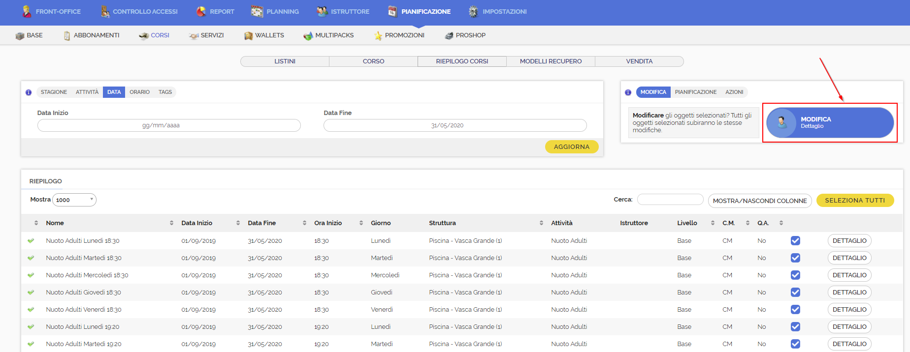 - Accedere alla sezione Pianificazione -> Corsi -> Riepilogo corsi.