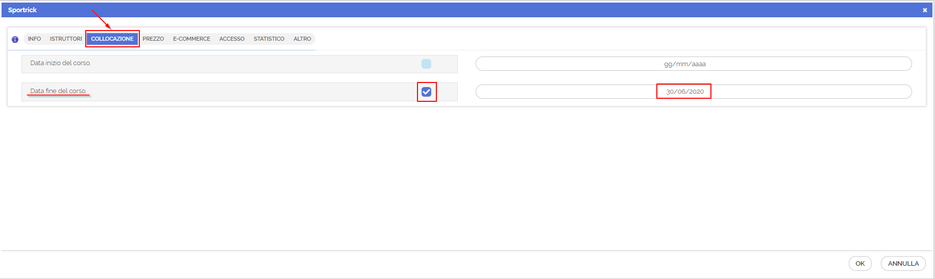 - Posizionarsi nella sezione Collocazione, digitare la nuova data fine prevista per i corsi (nel nostro esempio 30/06/2020) e cliccare il quadratino a fianco. Scegliere Ok per confermare e procedere con la modifica massiva della data di fine dei corsi selezionati.