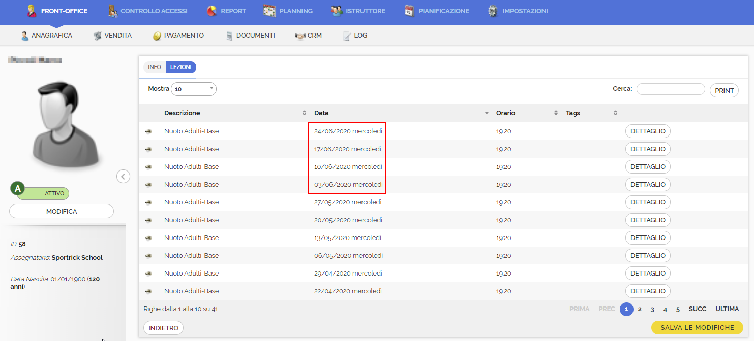 - Dopo un paio di minuti, si potranno visualizzare all'interno delle anagrafiche dei clienti iscritti ai corsi modificati le nuove lezioni aggiuntive pianificate: