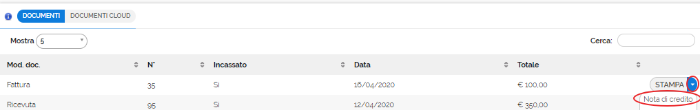 - cliccare sulla freccina al lato del pulsante stampa e cliccare sulla voce NOTA DI CREDITO;