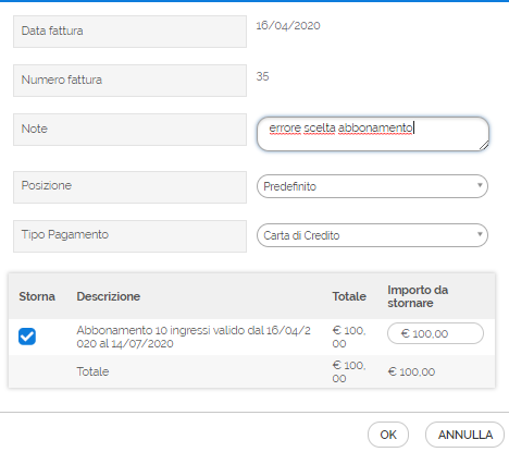 - Aggiungere eventuali note se necessario e selezionare quali righe del documento precedentemente emesso si vuole stornare e premere OK.