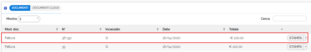 - Entrare nella sezione Documenti dell'anagrafica del cliente e trovare il documento da stornare;