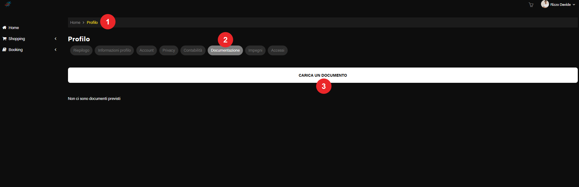 Dalla sezione Profilo (1) entrare nella tab Documentazione (2) e fare clic sul bottone Carica un Documento (3).