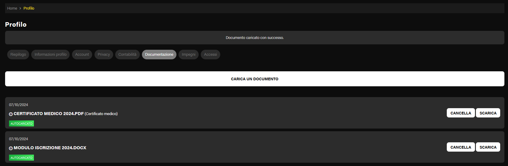 Dopo il caricamento, il cliente potrà visualizzare la lista dei documenti caricati e scaricarli nuovamente. Il certificato medico sarà chiaramente identificato rispetto agli altri documenti. Se il documento non è ancora stato accettato dalla segreteria, il cliente avrà la possibilità di cancellarlo. Tuttavia, questa operazione non sarà più possibile a seguito dell'accettazione.