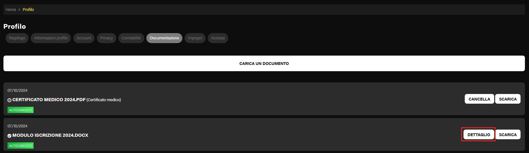 Una volta che la segreteria ha approvato il documento, il cliente vedrà un nuovo pulsante Dettaglio, che mostrerà le informazioni sulla data di caricamento e sulla data di approvazione.
